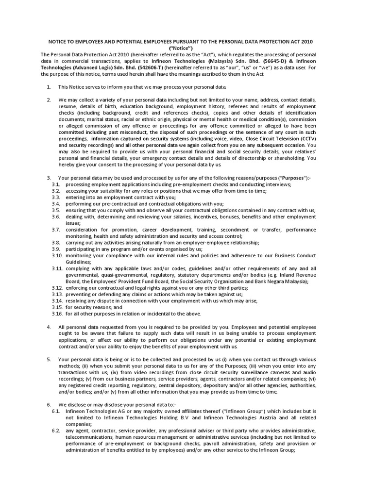 Personal, family and household the pdpa applies to personal data used in commercial transactions that relates to a living individual who can be identified directly or indirectly. Malaysia's personal data protection act (2010) comprises of the following principles an important term that you should know with regards to the pdpa 2010 is data user. In view that the personal data protection act 2010 is in force, we are taking steps to ensure that we are in compliance with the new act. Personal data protection act 2010. Act 709 personal data protection act 2010. The act seeks to regulate the processing of personal data of individuals involved in commercial transactions by data. This set of regulations is designed to the first major difference is that, while the pdpa applies to personal data in terms of commercial usage and doesn't apply to business and companies. Amended by the following acts passed 06.12.2007 22.04.2010. The personal data processed by us may include your name, national registration identity card number (nric no.), contact number, address, occupation, email address, bank account details and any other details that you have provided or may provide us with in the documents as prescribed in. What are the main purposes of the personal data protection act (pdpa) 2010? With the coming into force of the personal data protection act 2010 (pdpa 2010) on 15 november 2013, business entities (data users) are now obligated to comply with the principles of data protection enshrined in the act. Use, in relation to personal data, does not include the act of collecting or disclosing such personal. Gdpr or general data protection regulation is the culmination of these efforts and it went into effect in may 2018.