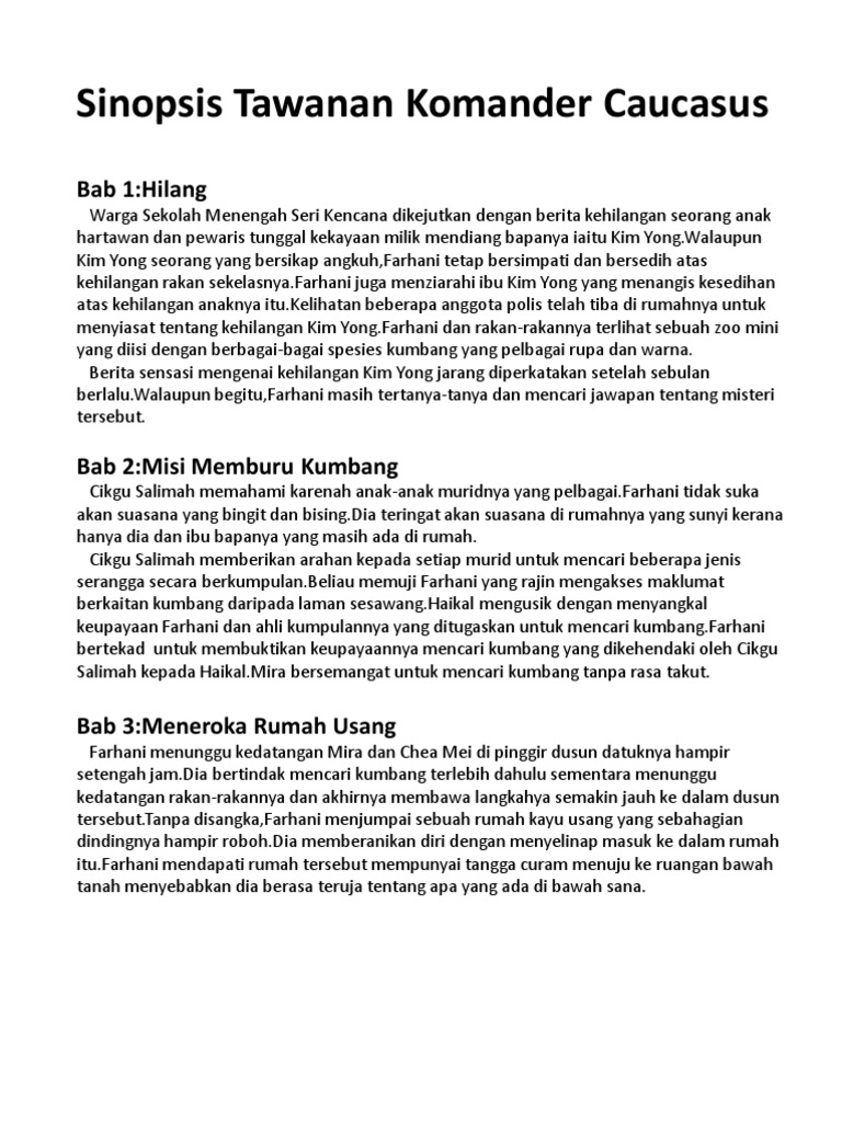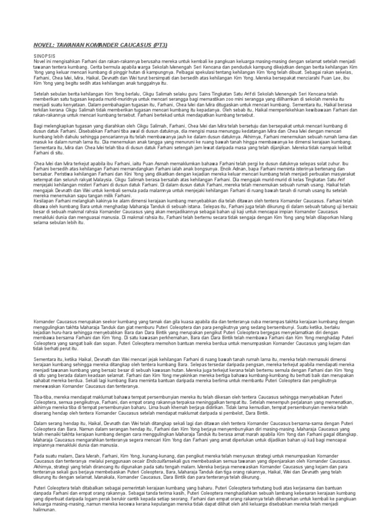 Watak & perwatakan, plot dan nilai pengajaran. Cerita bermula apabila warga sekolah menengah seri kencana dan penduduk kampung dikejutkan dengan. Start studying tawanan komander caucasus. Watak utama, farhani, terperangkap dalam dunia kumbang dan ditawan oleh komander chalcosoma caucasus perwatakan watak utama You have just read the article …. Novel 'tawanan komander caucasus' komsas tingkatan 3 (invisible moments). Posted on april 18, 2018 by adenium2. Novel tawanan komander caucasus 7 8. Dia seorang yang berhati mulia. Tawanan komander caucasus ketika manusia menjadi entiti marginal, hanya berupa subjek eksperimen di dalam tabung uji. Novel tawanan komander caucasus (novel bahasa melayu tingkatan 3). Ketua tentera kerajaan kumbang dan kumbang kepercayaan. Sinopsis, tema, persoalan, nilai, pengajaran, gaya bahasa, plot, teknik plot, watak dan perwatakan, latar tempat, latar masa, latar masyarakat, soalan + jawapan :